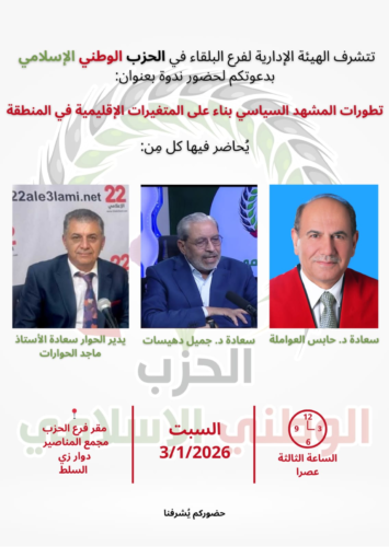 دعوة لحضور ندوة بعنوان: “تطورات المشهد السياسي بناء على المتغيرات الإقليمية في المنطقة” في البلقاء